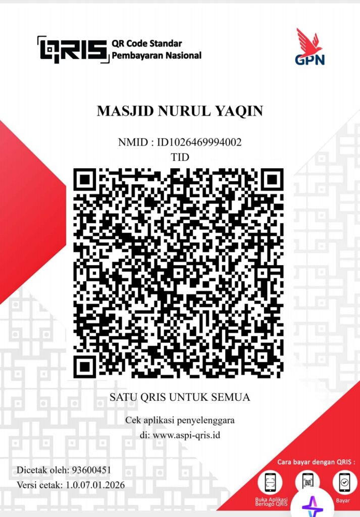 Untuk para jama’ah yang ingin menyisihkan sebagian rezekinya untuk berinfaq ke Masjid Nurul Yaqin,kami menyediakan QRIS sebagai alat transaksi digital.silahkan kirim bukti transaksi ke no WhatUp 0815-1718-5015 (Bendahara Masjid Nurul Yaqin)